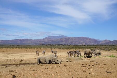 White rhinoceros laying down with other rhino and zebras with mountain background in safari, South Afica