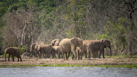 More than 200 elephants waiting in family groups to drink at Hapoor Dam