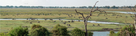 African elephants group grazing by the water. Wild animals panorama in Chobe National Park in Botswana Africa