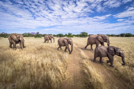 Group of five desert elephants on the search for food in the arid lands of Namibia