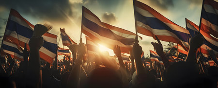 Crowd of people holding the flags of Thailand