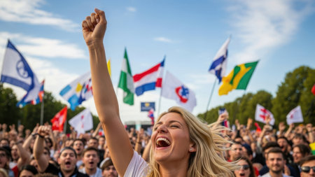 A blonde woman with her fist raised in celebration, surrounded by a large crowd of people and multiple flags.