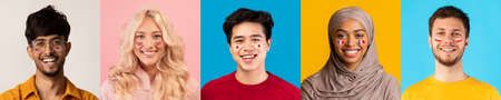 Photo set of cropped portraits of group of multi ethnic people on multicolored background. Collage.