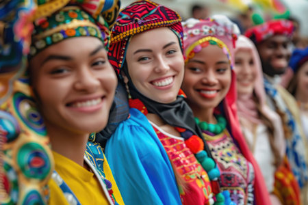 A vibrant and colorful portrait capturing a diverse group of young adults smiling joyfully together in front of a rich cultural background, symbolizing unity.