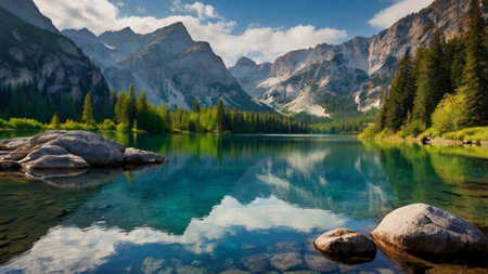 Beautiful alpine lake with reflection of mountains in the morning light.