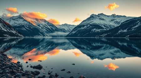 Snow peaks stand tall above a serene reflective lake glowing with dawn