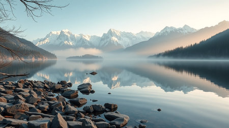 Mountain lake in the morning mist, Canadian Rockies, Alberta, Canada