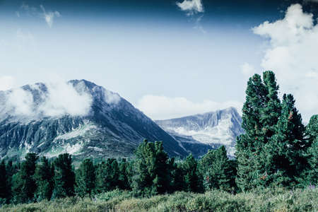 rocky high mountains. tops in the snow. tall spruce in the foreground. Forest fog laid on the tops of the trees weather mountains. Clouded Mountainside and Evergreen Tree Scape.