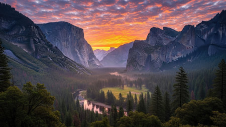 Yosemite Valleys dramatic cliffs dominate, bathed in sunset hues. A river winds through a dark green forest. The sky is a vibrant purple and pink. The scene evokes serenity and awe. No transparency in the background. A timeless natural landscape.