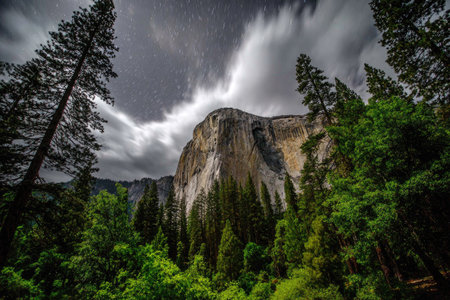 A stunning visual of a large rock formation rises above a dense forest. The scene is dominated by shades of green and grey, with a cloudy sky providing a contrasting backdrop. The image likely depicts an outdoor setting, potentially useful for travel or environmental themes, and can be used editorially.