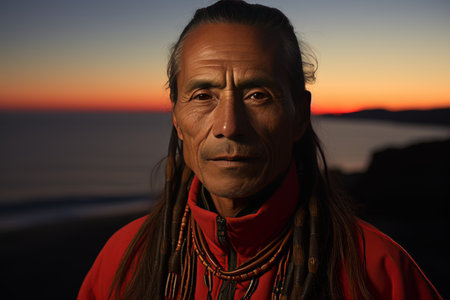 an american Indian standing in the warm glow of a red sunset, with ample space for adding text