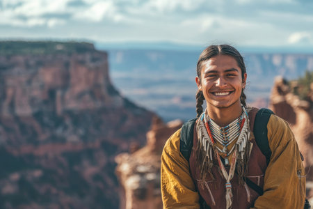 smiling happy young man standing on cliff with landscape behind him. Native American heritage day