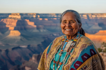 smiling old Native American woman in traditional attire standing on cliff with landscape behind her