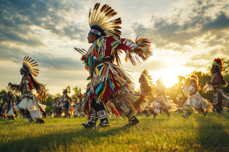Independence Day in the United States. traditional Native American powwow, with dancers in regalia performing ceremonial dances, honoring the rich indigenous heritage of the United States.