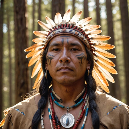 indigenous woman wearing a traditional feathered headdress and ornate jewelry stands with a serene expression in a lush forest, symbolizing cultural heritage and connection to nature