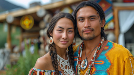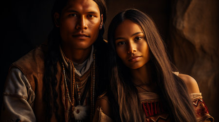 Portrait of a young couple in native american clothing looking at camera