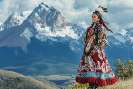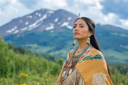 Young Native American girl in traditional attire stands proudly before majestic mountain landscape, symbolizing culture, identity, and heritage.