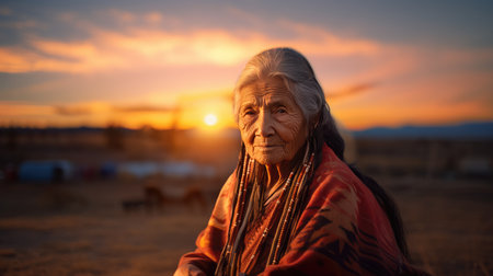 Old native senior American woman close-up portrait with wrinkles skin on golden sunset, outdoors in America nature. Indigenous people of first nation of americas. high quality photo