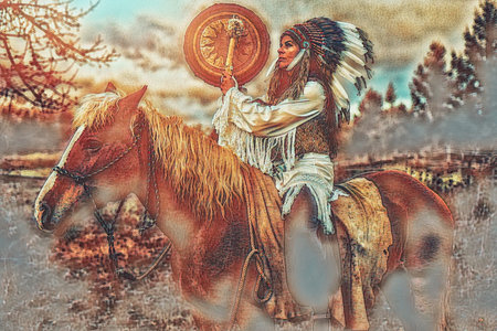 Shaman woman in landscape with her horse. Painting effect.