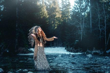 Beautiful shaman woman in native American Indian headdress with face painting and jewelry near river outdoors