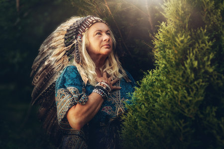 beautiful shamanic woman with headdress in the nature.