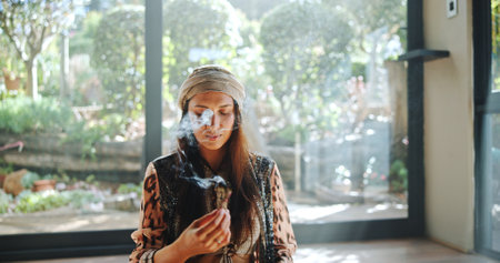 Woman, natural healing and incense with naturopath for Buddhism, ceremony and culture in studio. Healer, sage smoke and aromatherapy for spirituality with chakra clean or alternative medicine