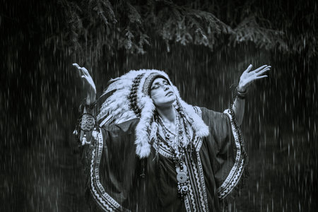 Native Americans. A black and white portrait of an American Indian girl in national dress and a feather headdress standing in the rain, speaking to the forces of nature.