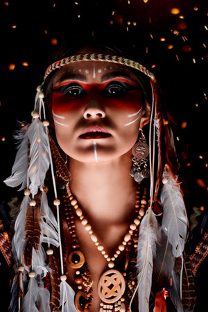 Beautiful shaman woman in native headdress with face painting outdoors
