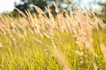 Field with wild grasses at sunset. Selective focus. Beautiful summer landscape, rural nature.