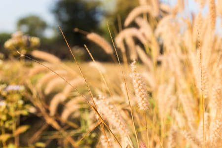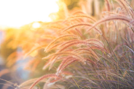 Close-up Beautiful African fountain flower blooming grass field with sunset light on background. Poaceae Grass Flowers, select focus only on some point
