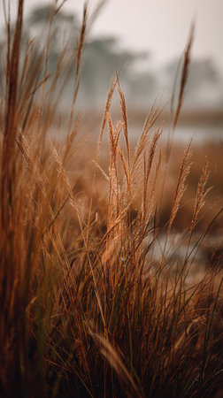 Tall golden grass stands gracefully against a soft mist, creating a peaceful scene in the countryside during early morning hours. Natures quiet beauty a focal point..