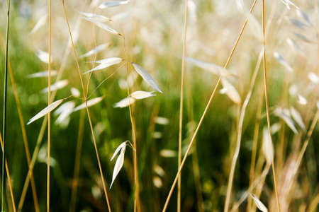 Wild grass with spikelets, summer plants. Green grass with golden and fluffy ears, nature. Spikelets of wild grass at sunset. Plants in the sun. Spikelets of wild wheat in the field