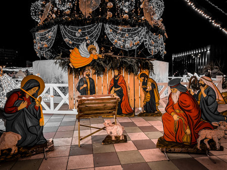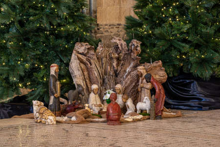 Life-size Nativity scene with baby Jesus, the Virgin Mary and Saint Joseph in a nativity scene in the main square of Valladolid, Spain