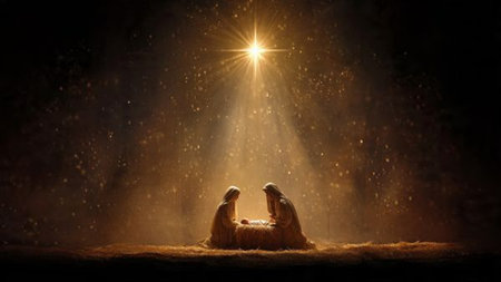 Dimly lit stable showing the Christian nativity scene with the baby Jesus glowing in light. Blank space above for text.