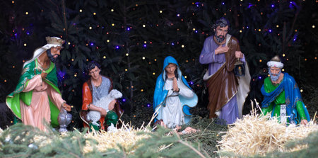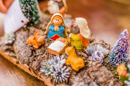 It's a Christmas theme. The figurines of the Holy family. Magnificent scenery for Christmas holidays.