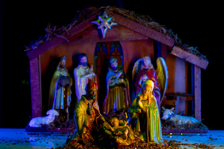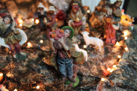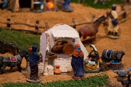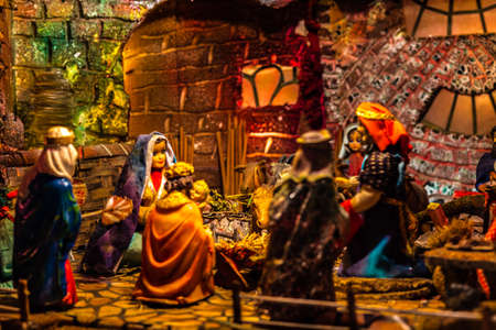 Christmas nativity scene with delicate figures recreating the Christian holiday. Classic Christmas scene lit by candles. Selective focus. Intimate light