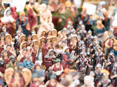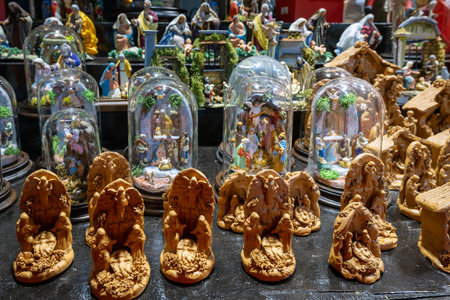 Naples, Italy - December 26, 2025: Miniature nativity scenes for sale on the stalls of an Gregorio Armeno, the famous street of Christmas gifts.