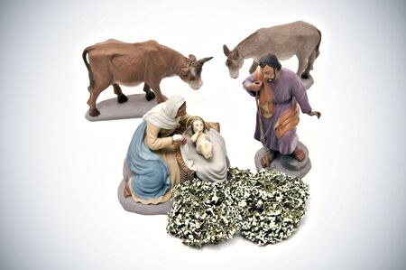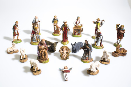 Christmas decorations, nativity scene statues isolated in a white background composition