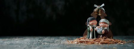 a depiction of the holy family, saint joseph, the virgin mary and the child jesus, on a gray wooden surface, against a black background, in a panoramic format to use as web banner
