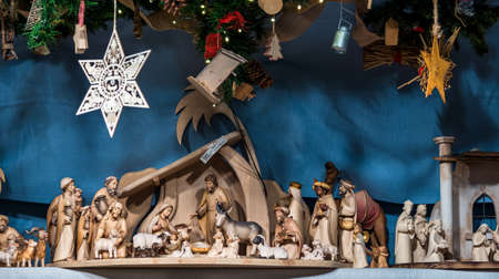 Nativity scene with resin figures of baby Jesus, Virgin Mary, Joseph, shepherds, and taxidermy animals. Christmas market in Luxembourg, Luxembourg - December 17, 2022