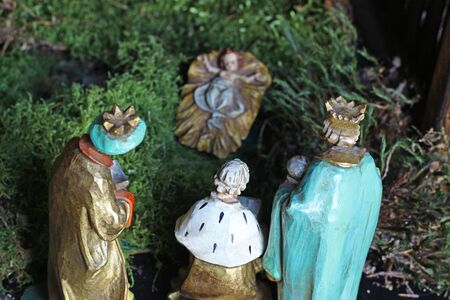 the three holy kings are bringing gifts to the new born child Jesus, rear view of the figurines, close-up