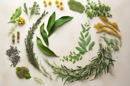 creative flat lay of herbs forming a spiral pattern, created with generative ai