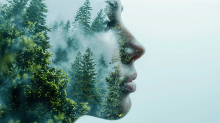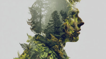 A conceptual double exposure image blending a human profile with lush green foliage, symbolizing a harmony between the mind and nature.