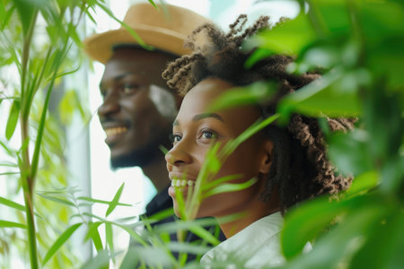 A woman interacts with green leaves, symbolizing a connection to nature and innovation