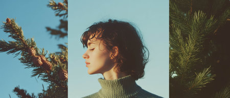 Fresh winter collage featuring a woman and fragrant pine branches