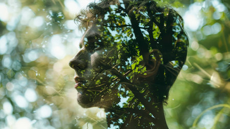 A unique blend of art and nature is captured in a double exposure image showing a mans face merging with trees, branches, and twigs