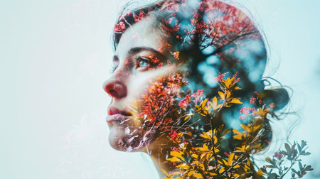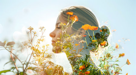 Double exposure of a woman with flowers and greenery. Nature and self-reflection concept
