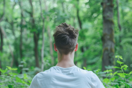 Young caucasian man standing in lush green forest, facing away and observing natures beauty.