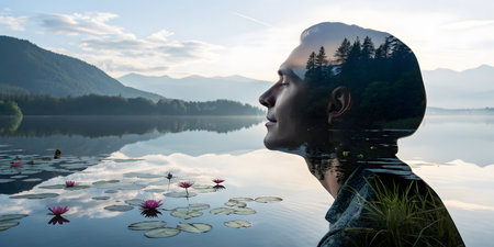 Double exposure image of a man meditating,profile view. His head is overlaid with a serene lakeside forest scene. Pink water lilies float on the calm water. Mountains and a clear sky form the backdrop. The atmosphere is peaceful and contemplative. The background is not transparent.