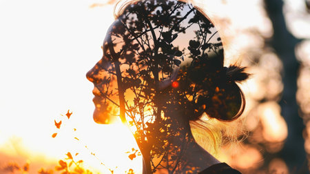 Double exposure portrait of young woman and tree at sunset in her head